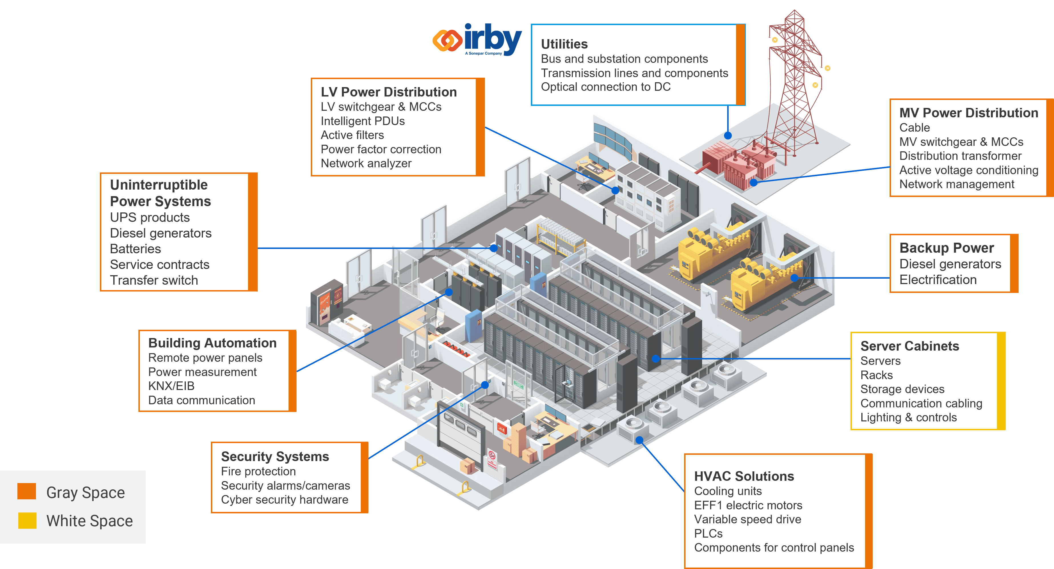 Sonepar’s family of companies delivers tailored solutions at every stage of a data center project from utility interconnection to networking technologies, power management and distribution solutions, and building automation solutions. With proven supply chain and project coordination expertise, Irby supplies products and sustaining services to support the electrical connection infrastructure (transmission, substation, and distribution) as well as optical passive and active connectivity solutions to the data center.